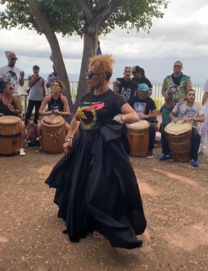 Las personas que están viendo el baile de bomba, comienzan a cantar. Se mueven al compás de la música mientras sus camisas negras bailan de izquierda a derecha. Gritan de emoción. Lloran de coraje, pero ese coraje se convierte también en expresiones que se escuchan por todo San Juan.