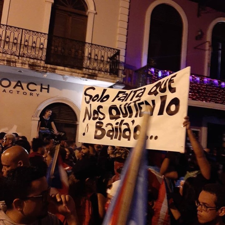 El público no dudó en gritar PUÑETA y en exigir la renuncia. Hay mas de cinco mil personas conglomeradas en la plaza. No se puede caminar, pero no es necesario hacerlo. Cada persona está ahí por un dolor distinto, en los ojos y en sus puños al aire se puede notar. Con las banderas arriba entonaron el himno revolucionario, porque como dijo René, el otro es del de Cristobal Colón y él mató a muchas personas. La canción nueva de René Pérez y Bad Bunny fue aplaudida y vitoreada. Ella recoge el dolor colectivo de un pueblo que despertó.