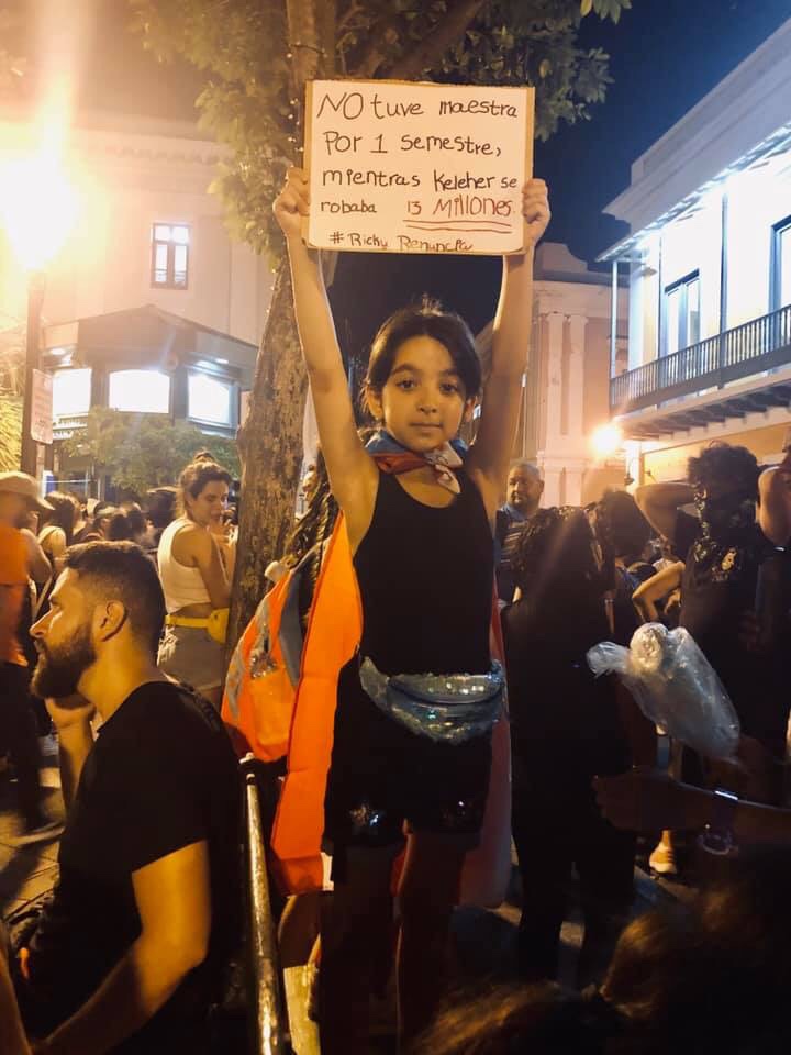 Según pasan las horas, el caminar se torna más pesado. En el viejo San Juan no cabe una persona más. Hay miles de personas caminando hacia la Plaza del Quinto Centenario. Las personas chocan, no tienen espacio. Tienen cartulinas con mensajes dirigidos al gobernador. Una cartulina tiene un mensaje que dice: Rosselló renuncia por dignidad y por tus hijos. Piensa en Claudia y en Pedrito, no los castigues así.