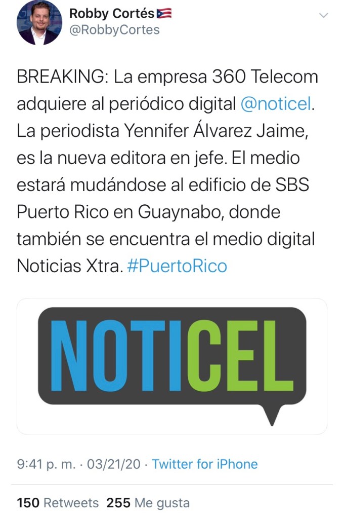 En los pasados días, se dio a conocer que el periódico digital NotiCel fue vendido a 360 TELECOM. Nada raro cuando solo lo lees, pero cuando investigas, te das cuenta que 360 TELECOM es una corporación donde sus oficiales pertenecen y son allegados al Partido Nuevo Progresista. Como si fuera poco, NotiCel ahora estará ubicado en el edificio de Spanish Broadcasting System. Sí, en el edificio de la famosa SBS, la estación que tiene un productor que está siendo juzgado a nivel federal por payola (paid for play) y no precisamente por una canción. Sí, digo que tiene un productor porque aunque Sixto George renunció a Nación Z, sigue paseándose y tomando té con los grandes de ahí.