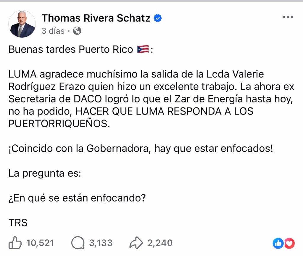 ¡Que mucha mierda leí mientras pasaba un fin de semana espectacular junto a mi esposo y mis gemelos que tanto amo! Cuando fue oficial el despido de Valerie Rodríguez Erazo, el presidente del Senado apareció para hacer su ritual lleno de ironía y sarcasmo: elogió a LUMA y su “agradecimiento” por la salida de la secretaria. Sí, agradeció que se quitara de en medio a quien los obligaba a responder. Pero no se quedó allí: al final me lanzó su crítica irónica a la por haberla despedido. Como quien da palmaditas mientras te escupe en la cara. Así es la política pública en Puerto Rico: sarcasmo y traición oficial, envuelto en formalidad. Y para ser honesta, NO me importa, porque mi ego es más grande que todos sus “Buenos días” en Facebook. (Metro PR)